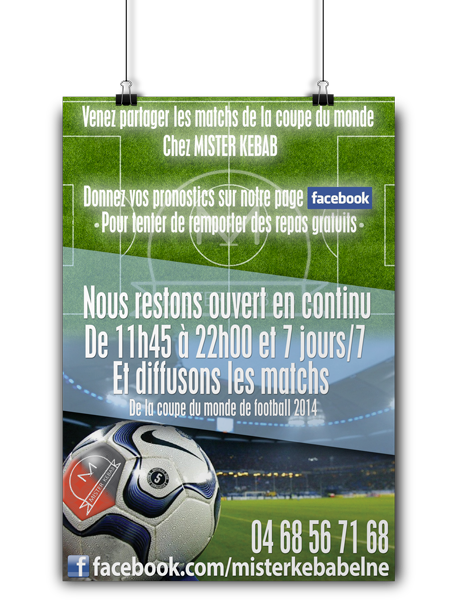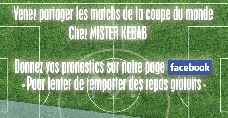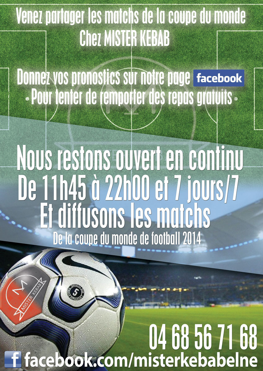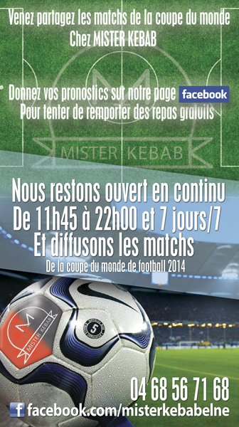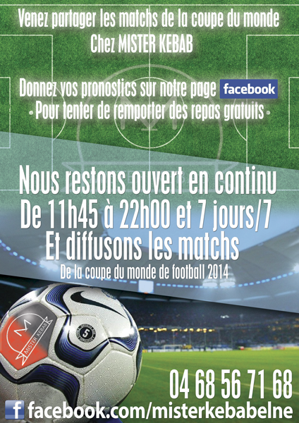 À l'occasion de la coupe du monde de football 2014, Mister Kebab sera ouvert en continu et tous les jours. De plus, il diffusera l'ensemble des matchs qui se joueront entre 11h45 et 22h00.